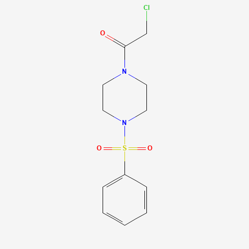 - Synonyms:1-[4-(benzenesulfonyl)piperazin-1-yl]-2-chloroethan-1-one;722491-33-0;1-[4-(benzenesulfonyl)piperazin-1-yl]-2-chloroethanone;1-(chloroacetyl)-4-(phenylsulfonyl)piperazine;SCHEMBL20300422;MAK-UNK-7c9d1431-9;BDBM496574;AKOS001042098;CS-0221027;EN300-08172;SR-01000046965;SR-01000046965-1;Z56943591
