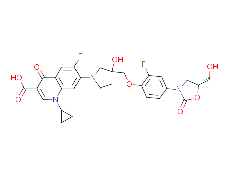 - Synonyms:1-cyclopropyl-6-fluoro-7-{(RS)-3-[2-fluoro-4-((R)-5-hydroxymethyl-2-oxo-oxazolidin-3-yl)-phenoxymethyl]-3-hydroxy-pyrrolidin-1-yl}-4-oxo-1,4dihydro-quinoline-3-carboxylic acid