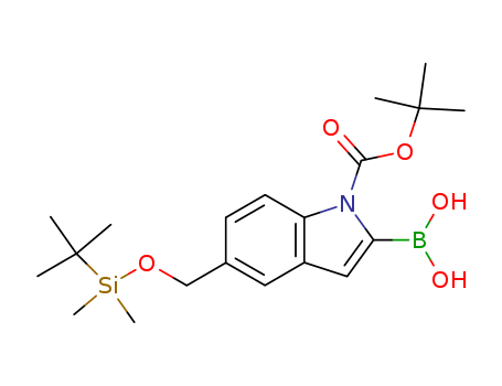 - Synonyms:1H-Indole-1-carboxylicacid, 2-borono-5-[[[(1,1-dimethylethyl)dimethylsilyl]oxy]methyl]-,1-(1,1-dimethylethyl) ester (9CI);[1-tert-Butoxycarbonyl-5-[(tert-butyldimethylsilanyloxy)methyl]-1H-indol-2-yl]boronicacid;[5-[[(tert-Butyldimethylsilyl)oxy]methyl]-1-(tert-butyloxycarbonyl)indol-2-yl]boronicacid