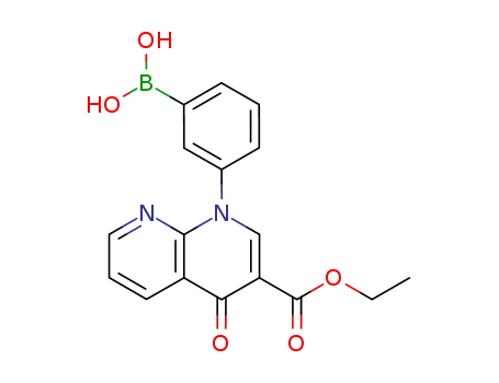 - Synonyms:1,8-NAPHTHYRIDINE-3-CARBOXYLIC ACID, 1-(3-BORONOPHENYL)-1,4-DIHYDRO-4-OXO-, 3-ETHYL ESTER;3-(3-(ethoxycarbonyl)-4-oxo-1,8-naphthyridin-1(4H)-yl)phenylboronic acid
