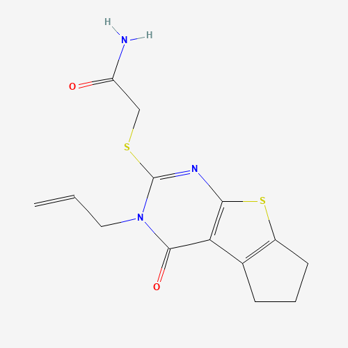 - Synonyms:499232-09-6;2-(5-Allyl-4-oxo-2,3,4,5-tetrahydro-1H-8-thia-5,7-diaza-cyclopenta[a]inden-6-ylsulfanyl)-acetamide;MLS001211669;CHEMBL1494608;DTXSID301327775;HMS2844E03;STK999299;AKOS000642449;SMR000519152;Z20221709;2-[(12-oxo-11-prop-2-enyl-7-thia-9,11-diazatricyclo[6.4.0.02,6]dodeca-1(8),2(6),9-trien-10-yl)sulfanyl]acetamide;2-{[4-oxo-3-(prop-2-en-1-yl)-3,5,6,7-tetrahydro-4H-cyclopenta[4,5]thieno[2,3-d]pyrimidin-2-yl]sulfanyl}acetamide