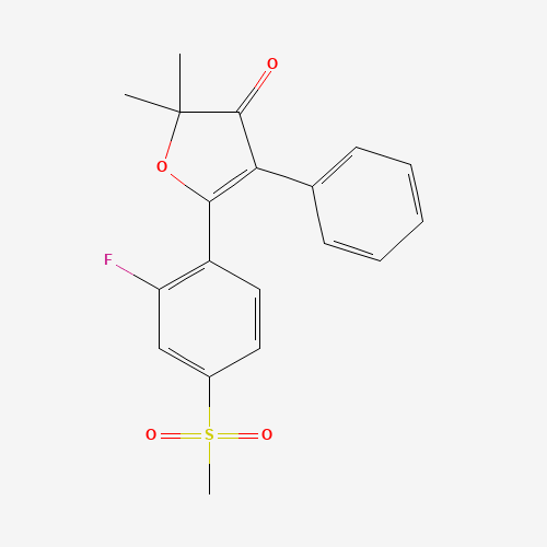 - Synonyms:CHEMBL354123;SCHEMBL6994338;ZAZFRSORMPTNQL-UHFFFAOYSA-N;DTXSID301145359;BDBM50474776;2,2-dimethyl-5-{2-fluoro-4-(methylsulfonyl)phenyl}-4-phenyl-3(2H)-furanone;301695-67-0;5-[2-Fluoro-4-(methylsulfonyl)phenyl]-2,2-dimethyl-4-phenyl-3(2H)-furanone