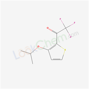 - Synonyms:ethanone, 2,2,2-trifluoro-1-[3-(1-methylethoxy)-2-thienyl]-;2,2,2-trifluoro-1-(3-isopropoxy-2-thienyl)ethanone;1/C9H9F3O2S/c1-5(2)14-6-3-4-15-7(6)8(13)9(10,11)12/h3-5H,1-2H;