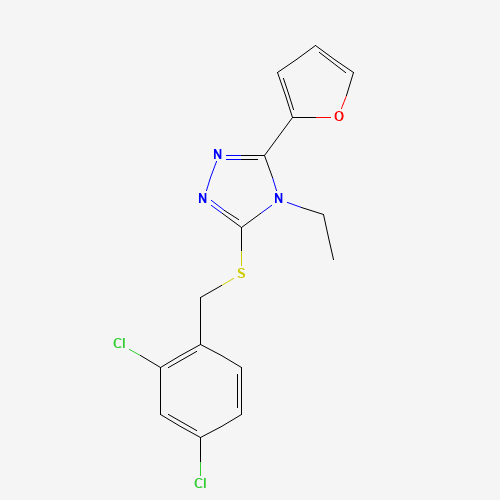 - Synonyms:585554-06-9;3-{[(2,4-dichlorophenyl)methyl]sulfanyl}-4-ethyl-5-(furan-2-yl)-4H-1,2,4-triazole;3-((2,4-Dichlorobenzyl)thio)-4-ethyl-5-(furan-2-yl)-4H-1,2,4-triazole;STL297181;AKOS002189451;Z14370260;2,4-DICHLOROBENZYL 4-ETHYL-5-(2-FURYL)-4H-1,2,4-TRIAZOL-3-YL SULFIDE;3-[(2,4-dichlorobenzyl)sulfanyl]-4-ethyl-5-(furan-2-yl)-4H-1,2,4-triazole