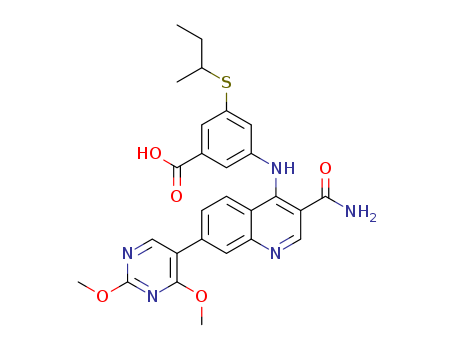 - Synonyms:3-(sec-butylthio)-5-((3-carbamoyl-7-(2,4-dimethoxypyrimidin-5-yl)quinolin-4-yl)amino)benzoic acid