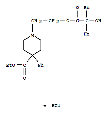 - Synonyms:4-Piperidinecarboxylicacid, 1-[2-[(hydroxydiphenylacetyl)oxy]ethyl]-4-phenyl-, ethyl ester,hydrochloride (9CI); Isonipecotic acid, 1-(2-hydroxyethyl)-4-phenyl-, ethylester, benzilate (ester), hydrochloride (8CI); Benzilic acid, ester with ethyl1-(2-hydroxyethyl)-4-phenylisonipecotate hydrochloride
