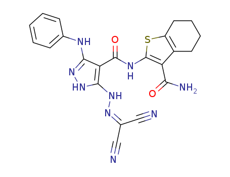 - Synonyms:5-(N'-dicyanomethylene-hydrazino)-3-phenyl-amino-1H-pyrazole-4-carboxylic acid (3-carbamoyl-4,5,6,7-tetrahydro-benzo[b]thiophen-2-yl)-amide