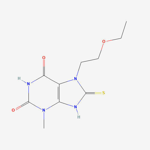 - Synonyms:7-(2-ethoxyethyl)-3-methyl-8-sulfanylidene-9H-purine-2,6-dione;7-(2-ethoxyethyl)-8-mercapto-3-methyl-1H-purine-2,6(3H,7H)-dione;STL043430;7-(2-ethoxyethyl)-3-methyl-8-sulfanyl-1,3,7-trihydropurine-2,6-dione;AKOS000723723;AKOS005696782;CCG-305248;UPCMLD0ENAT5732427:001;AB00673590-01;F1191-0066;Z223837866;7-(2-ethoxyethyl)-8-mercapto-3-methyl-3,7-dihydro-1H-purine-2,6-dione;7-(2-ethoxyethyl)-6-hydroxy-3-methyl-8-thioxo-3,7,8,9-tetrahydro-2H-purin-2-one