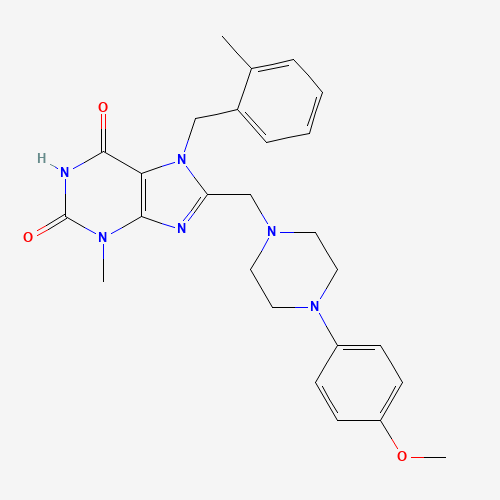 - Synonyms:847408-06-4;8-{[4-(4-METHOXYPHENYL)PIPERAZIN-1-YL]METHYL}-3-METHYL-7-[(2-METHYLPHENYL)METHYL]-2,3,6,7-TETRAHYDRO-1H-PURINE-2,6-DIONE;8-((4-(4-methoxyphenyl)piperazin-1-yl)methyl)-3-methyl-7-(2-methylbenzyl)-1H-purine-2,6(3H,7H)-dione;CHEMBL1484567;DTXSID301107270;HMS1834I01;AKOS001365335;NCGC00111817-01;C692-0279;F0669-0305;Z238883310;3,7-Dihydro-8-[[4-(4-methoxyphenyl)-1-piperazinyl]methyl]-3-methyl-7-[(2-methylphenyl)methyl]-1H-purine-2,6-dione;8-[[4-(4-methoxyphenyl)piperazin-1-yl]methyl]-3-methyl-7-[(2-methylphenyl)methyl]purine-2,6-dione