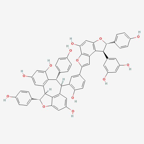 - Synonyms:Amurensin K;37E366SR4Q;388121-56-0;Rel-(+)-(1R,6S,7R,11bR)-6-(5-((7R,8R)-8-(3,5-dihydroxyphenyl)-7,8-dihydro-4-hydroxy-7-(4-hydroxyphenyl)benzo(1,2-b:4,3-b)difuran-2-yl)-2-hydroxyphenyl)-1,6,7,11b-tetrahydro-1,7-bis(4-hydroxyphenyl)benzo(6,7)cyclohepta(1,2,3-cd)benzofuran-4,8,10-triol;(1S,6R,7S,11bS)-6-(5-((7S,8S)-8-(3,5-Dihydroxyphenyl)-4-hydroxy-7-(4-hydroxyphenyl)-7,8-dihydrobenzo(1,2-b:4,3-b')difuran-2-yl)-2-hydroxyphenyl)-1,7-bis(4-hydroxyphenyl)-1,6,7,11b-tetrahydrobenzo(6,7)cyclohepta(1,2,3-cd)(1)benzofuran-4,8,10-triol;(1S,6R,7S,11bS)-6-{5-[(7S,8S)-8-(3,5-Dihydroxyphenyl)-4-hydroxy-7-(4-hydroxyphenyl)-7,8-dihydrobenzo[1,2-b:4,3-b']difuran-2-yl]-2-hydroxyphenyl}-1,7-bis(4-hydroxyphenyl)-1,6,7,11b-tetrahydrobenzo[6,7]cyclohepta[1,2,3-cd][1]benzofuran-4,8,10-triol;UNII-37E366SR4Q;DTXSID801045300;Q4748993;BENZO(6,7)CYCLOHEPTA(1,2,3-CD)BENZOFURAN-4,8,10-TRIOL, 6-(5-((7R,8R)-8-(3,5-DIHYDROXYPHENYL)-7,8-DIHYDRO-4-HYDROXY-7-(4-HYDROXYPHENYL)BENZO(1,2-B:4,3-B)DIFURAN-2-YL)-2-HYDROXYPHENYL)-1,6,7,11B-TETRAHYDRO-1,7-BIS(4-HYDROXYPHENYL)-, (1R,6S,7R,11BR)-REL-(+)-