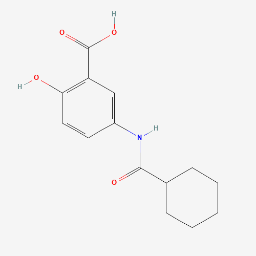- Synonyms:339202-39-0;Benzoic acid, 5-[(cyclohexylcarbonyl)amino]-2-hydroxy-;SCHEMBL1516160;UXDNLNRHRJGTOI-UHFFFAOYSA-N;DTXSID601222299;5-cyclohexanoylamino-salicylic acid;AKOS000129379;5-[(Cyclohexylcarbonyl)amino]-2-hydroxybenzoic acid