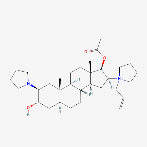 - Synonyms:C1QY4G1ZL6;942983-83-7;UNII-C1QY4G1ZL6;PIPERIDINYL ROCURONIUM;Rocuronium bromide impurity E [EP];ROCURONIUM BROMIDE IMPURITY E [EP IMPURITY];1-((2.BETA.,3.ALPHA.,5.ALPHA.,16.BETA.,17.BETA.)-17-(ACETYLOXY)-3-HYDROXY-2-(1-PYRROLIDINYL)ANDROSTAN-16-YL)-1-(2-PROPEN-1-YL)PYRROLIDINIUM;1-((2beta,3alpha,5alpha,16beta,17beta)-17-(Acetyloxy)-3-hydroxy-2-(1-pyrrolidinyl)androstan-16-yl)-1-(2-propen-1-yl)pyrrolidinium;1-(17.BETA.-(ACETYLOXY)-3.ALPHA.-HYDROXY-2.BETA.-(PYRROLIDIN-1-YL)-5.ALPHA.-ANDROSTAN-16.BETA.-YL)-1-(PROP-2-ENYL)PYRROLIDINIUM;1-(17.BETA.-ACETOXY-3.ALPHA.-HYDROXY-2.BETA.-(PYRROLIDIN-1-YL)-5.ALPHA.-ANDROSTAN-16.BETA.-YL)-1-(PROP-2-ENYL)PYRROLIDINIUM;1-(17beta-(Acetyloxy)-3alpha-hydroxy-2beta-(pyrrolidin-1-yl)-5alpha-androstan-16beta-yl)-1-(prop-2-enyl)pyrrolidinium;1-(17beta-Acetoxy-3alpha-hydroxy-2beta-(pyrrolidin-1-yl)-5alpha-androstan-16beta-yl)-1-(prop-2-enyl)pyrrolidinium;PYRROLIDINIUM, 1-((2.BETA.,3.ALPHA.,5.ALPHA.,16.BETA.,17.BETA.)-17-(ACETYLOXY)-3-HYDROXY-2-(1-PYRROLIDINYL)ANDROSTAN-16-YL)-1-(2-PROPEN-1-YL)-;Pyrrolidinium, 1-((2beta,3alpha,5alpha,16beta,17beta)-17-(acetyloxy)-3-hydroxy-2-(1-pyrrolidinyl)androstan-16-yl)-1-(2-propen-1-yl)-