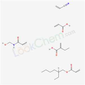 - Synonyms:2-Propenoic acid, polymer with 2-ethylhexyl 2-propenoate, ethyl 2-propenoate, N-(hydroxymethyl)-2-propenamide and 2-propenenitrile;Ethyl acrylate-acrylic acid-2-ethylhexyl acrylate-N-methylolacrylamide-acrylonitrile polymer;2-ethylhexyl prop-2-enoate;N-(hydroxymethyl)prop-2-enamide;ethyl-, 2-ethylhexyl- acrylate/acrylonitrile/acrylic acid