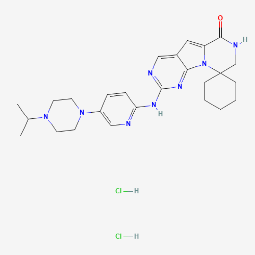 - Synonyms:G1T38 dihydrochloride;2097938-59-3;Lerociclib (dihydrochloride);Lerociclib dihydrochloride;G1T38 HCl;Z16QQQ3HA6;4-[[5-(4-propan-2-ylpiperazin-1-yl)pyridin-2-yl]amino]spiro[1,3,5,11-tetrazatricyclo[7.4.0.02,7]trideca-2,4,6,8-tetraene-13,1'-cyclohexane]-10-one;dihydrochloride;Spiro(cyclohexane-1,9'(6'H)-pyrazino(1',2':1,5)pyrrolo(2,3-d)pyrimidin)-6'-one, 7',8'-dihydro-2'-((5-(4-(1-methylethyl)-1-piperazinyl)-2-pyridinyl)amino)-, hydrochloride (1:2);UNII-Z16QQQ3HA6;SCHEMBL23711495;EX-A3076-1;HY-112272A;MS-30032;G1T38 dihydrochlorideG1T38 dihydrochloride;CS-0063473