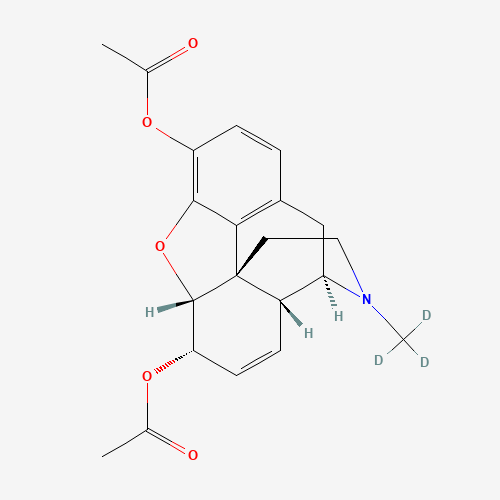 - Synonyms:Heroin-d3;Diamorphine, D3-;219533-68-3;Diamorphine, (N-methyl-d3)-;326U6SBN78;UNII-326U6SBN78;Heroin-D3 (3,6-Diacetylmorphine-D3);[(4R,4aR,7S,7aR,12bS)-9-acetyloxy-3-(trideuteriomethyl)-2,4,4a,7,7a,13-hexahydro-1H-4,12-methanobenzofuro[3,2-e]isoquinolin-7-yl] acetate;Morphinan-3,6-diol, 7,8-didehydro-4,5-epoxy-17-(methyl-d3)-, 3,6-diacetate, (5alpha,6alpha)-;Morphinan-3,6-diol, 7,8-didehydro-4,5-epoxy-17-(methyl-d3)-, diacetate (ester), (5alpha,6alpha)- (9CI);Heroin-D3, Diacetylmorphine-D3;CHEBI:228507;DTXSID601344691;Heroin-D3 (3,6-Diacetylmorphine-D3), 1mg/ml in Acetonitrile;Heroin-D3 (3,6-Diacetylmorphine-D3), 0.1mg/ml in Acetonitrile;[(4R,4aR,7S,7aR,12bS)-9-acetyloxy-3-(trideuteriomethyl)-2,4,4a,7,7a,13-hexahydro-1H-4,12-methanobenzouro[3,2-e]isoquinolin-7-yl] acetate;MORPHINAN-3,6-DIOL, 7,8-DIDEHYDRO-4,5-EPOXY-17-(METHYL-D3)-, 3,6-DIACETATE, (5.ALPHA.,6.ALPHA.)-
