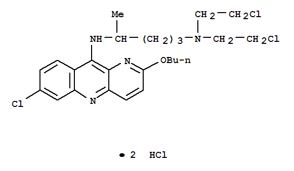 - Synonyms:1,4-Pentanediamine,N4-(2-butoxy-7-chlorobenzo[b]-1,5-naphthyridin-10-yl)-N1,N1-bis(2-chloroethyl)-,dihydrochloride (9CI); Benzo[b]-1,5-naphthyridine, 1,4-pentanediamine deriv.