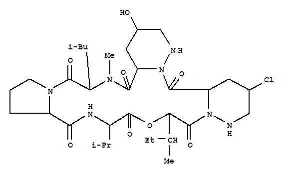 - Synonyms:2H-Dipyridazino[1,6-d:1',6'-g]pyrrolo[1,2-m][1,4,7,10,13,16]oxapentaazacyclooctadecine,cyclic peptide deriv.; D-Valine, N-[1-[N-[[2-[[D-trans-5-chlorohexahydro-2-(L-erythro-2-hydroxy-3-methyl-1-oxopentyl)-3-pyridazinyl]carbonyl]-L-hexahydro-cis-5-hydroxy-3-pyridazinyl]carbonyl]-N-methyl-D-leucyl]-L-prolyl]-,p-lactone;N-[1-[N-[[2-[[D-trans-5-Chlorohexahydro-2-(L-erythro-2-hydroxy-3-methyl-1-oxopentyl)-3-pyridazinyl]carbonyl]-L-hexahydro-cis-5-hydroxy-3-pyridazinyl]carbonyl]-N-methyl-D-leucyl]-L-prolyl]-D-valinep-lactone