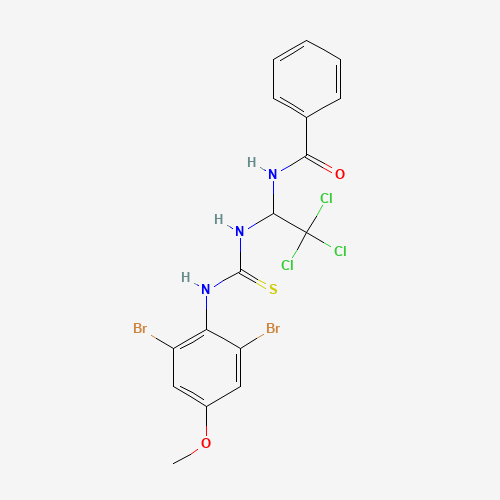 - Synonyms:AKOS002686739;N-(2,2,2-TRI-CL-1-(((2,6-DIBROMO-4-METHOXYANILINO)CARBOTHIOYL)AMINO)ET)BENZAMIDE