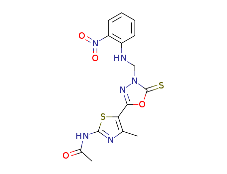 - Synonyms:N-(4-methyl-5-(4-(((2-nitrophenyl)amino)methyl)-5-thioxo-4,5-dihydro-1,3,4-oxadiazol-2-yl)thiazol-2-yl)acetamide