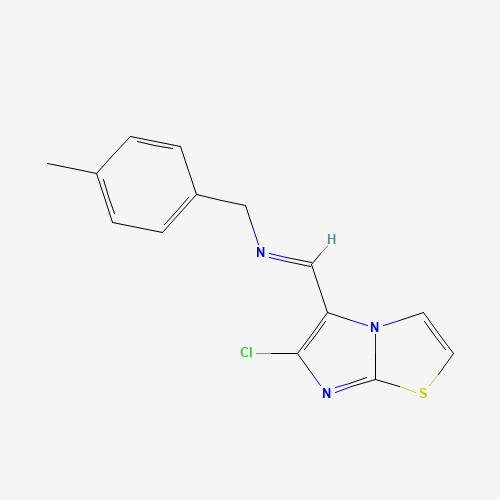 - Synonyms:241132-52-5;N-[(6-chloroimidazo[2,1-b][1,3]thiazol-5-yl)methylene](4-methylphenyl)methanamine;(E)-({6-chloroimidazo[2,1-b][1,3]thiazol-5-yl}methylidene)[(4-methylphenyl)methyl]amine;1-(6-chloroimidazo[2,1-b][1,3]thiazol-5-yl)-N-[(4-methylphenyl)methyl]methanimine;N-((6-CHLOROIMIDAZO(2,1-B)(1,3)THIAZOL-5-YL)METHYLENE)(4-METHYLPHENYL)METHANAMINE;AKOS005074088;AKOS030243627;10D-077S;({6-chloroimidazo[2,1-b][1,3]thiazol-5-yl}methylidene)[(4-methylphenyl)methyl]amine;(E)-N-((6-chloroimidazo[2,1-b]thiazol-5-yl)methylene)-1-p-tolylmethanamine