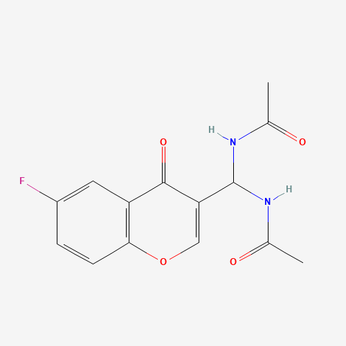 - Synonyms:924858-91-3;DTXSID701163638;N,N'-[(6-Fluoro-4-oxo-4H-1-benzopyran-3-yl)methylene]bis[acetamide];AKOS016347582;N-[acetamido-(6-fluoro-4-oxochromen-3-yl)methyl]acetamide;N-[(Acetylamino)(6-fluoro-4-oxo-4H-chromen-3-yl)methyl]acetamide;N,Na(2)-[(6-Fluoro-4-oxo-4H-1-benzopyran-3-yl)methylene]bis[acetamide]