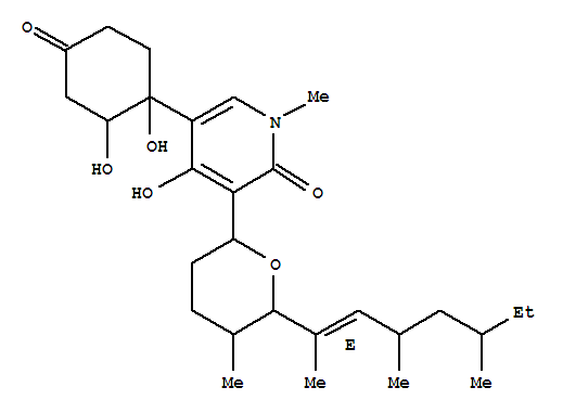 - Synonyms:2(1H)-Pyridinone,5-(1,2-dihydroxy-4-oxocyclohexyl)-4-hydroxy-1-methyl-3-[tetrahydro-5-methyl-6-(1,3,5-trimethyl-1-heptenyl)-2H-pyran-2-yl]-;2(1H)-Pyridinone,5-(1,2-dihydroxy-4-oxocyclohexyl)-4-hydroxy-1-methyl-3-[tetrahydro-5-methyl-6-[(1E)-1,3,5-trimethyl-1-heptenyl]-2H-pyran-2-yl]-,(+)- (9CI); Oxysporidinone