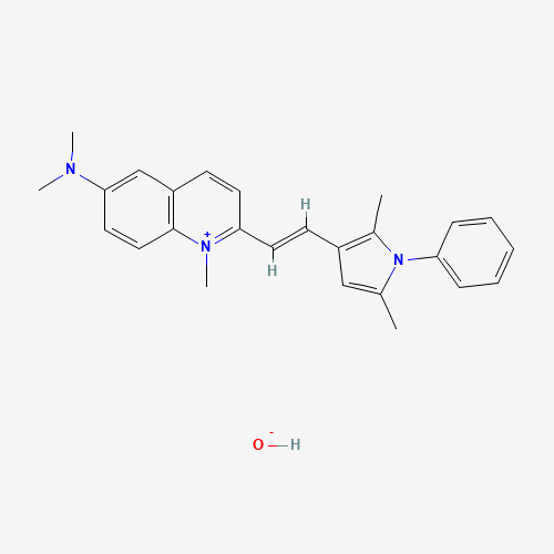 - Synonyms:Pyrvinium hydroxide;Pyrvinium [WHO-DD];UNII-JZ0LJI3C3M;JZ0LJI3C3M;641-69-0;Quinolinium, 6-(dimethylamino)-2-(2-(2,5-dimethyl-1-phenyl-1H-pyrrol-3-yl)ethenyl)-1-methyl-, hydroxide;Quinolinium, 6-(dimethylamino)-2-(2-(2,5-dimethyl-1-phenyl-1H-pyrrol-3-yl)ethenyl)-1-methyl-, hydroxide (1:1);Q27281748