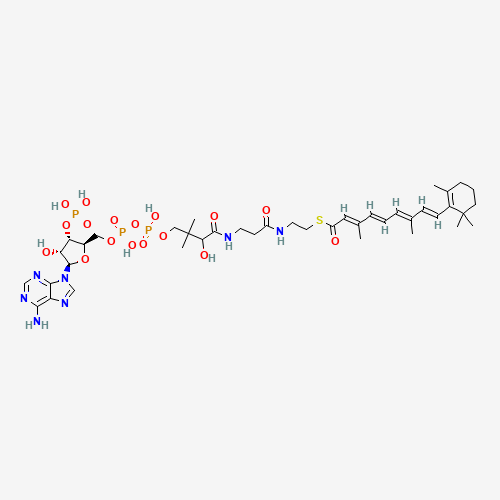- Synonyms:Retinoyl CoA;81295-48-9;S-[2-[3-[[4-[[[(2R,3S,4R,5R)-5-(6-aminopurin-9-yl)-4-hydroxy-3-phosphonooxyoxolan-2-yl]methoxy-hydroxyphosphoryl]oxy-hydroxyphosphoryl]oxy-2-hydroxy-3,3-dimethylbutanoyl]amino]propanoylamino]ethyl] (2E,4E,6E,8E)-3,7-dimethyl-9-(2,6,6-trimethylcyclohexen-1-yl)nona-2,4,6,8-tetraenethioate;Retinoyl coenzyme A;Retinol acyltransferase;retinol O-acyltransferase;Acyl-CoA-retinol acyltransferase;Acyl-CoA-retinol acyltransferase.;Acyl-Coenzyme A-retinol acyltransferase;Acyl-Coenzyme A-retinol acyltransferase.;{[(2R,3S,4R,5R)-5-(6-amino-9H-purin-9-yl)-2-({[({[3-({2-[(2-{[(2E,4E,6E,8E)-3,7-dimethyl-9-(2,6,6-trimethylcyclohex-1-en-1-yl)nona-2,4,6,8-tetraenoyl]sulfanyl}ethyl)carbamoyl]ethyl}carbamoyl)-3-hydroxy-2,2-dimethylpropoxy](hydroxy)phosphoryl}oxy)(hydroxy)phosphoryl]oxy}methyl)-4-hydroxyoxolan-3-yl]oxy}phosphonic acid