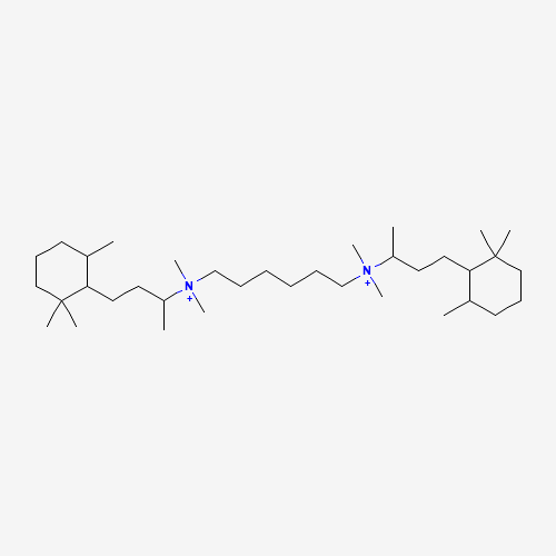 - Synonyms:Triclobisonium;Triclobisonium ion;Triclobisonium cation;UNII-D75WGE9M1B;D75WGE9M1B;1,6-Hexanediaminium, N,N,N',N'-tetramethyl-N,N'-bis(1-methyl-3-(2,2,6-trimethylcyclohexyl)propyl)-;1,6-Hexanediaminium, N1,N1,N6,N6-tetramethyl-N1,N6-bis(1-methyl-3-(2,2,6-trimethylcyclohexyl)propyl)-;7187-64-6;1,6-Hexanediaminium, N,N,N',N'-tetramethyl-N,N'-bis[1-methyl-3-(2,2,6-trimethylcyclohexyl)propyl]-;TRICLOBISONIUM [WHO-DD];CHEMBL2110626;DTXSID30861641;Q27276204;Ammonium, hexamethylenebis[dimethyl[1-methyl-3-(2,2,6-trimethylcyclohexyl)propyl]-;N,N,N',N'-Tetramethyl-N,N'-bis[1-methyl-3-(2,2,6-trimethylcyclohexyl)propyl]-1,6-hexanediaminium;N~1~,N~1~,N~6~,N~6~-Tetramethyl-N~1~,N~6~-bis[4-(2,2,6-trimethylcyclohexyl)butan-2-yl]hexane-1,6-bis(aminium)