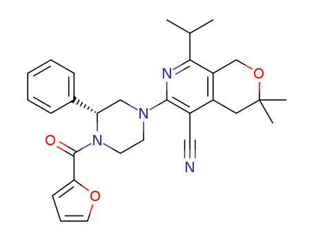 (R)-6-(4-(furan-2-carbonyl)-3-phenylpiperazin-1-yl)-8-isopropyl-3,3-dimethyl-3,4-dihydro-1H-pyrano[3,4-c]pyridine-5-carbonitrile(1416267-37-2)