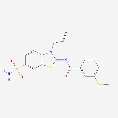 - Synonyms:887202-55-3;3-(methylsulfanyl)-N-[(2Z)-3-(prop-2-en-1-yl)-6-sulfamoyl-2,3-dihydro-1,3-benzothiazol-2-ylidene]benzamide;DTXSID901122587;AKOS024659842;MCULE-7000284584;(Z)-N-(3-allyl-6-sulfamoylbenzo[d]thiazol-2(3H)-ylidene)-3-(methylthio)benzamide;F2554-0384;3-methylsulfanyl-N-(3-prop-2-enyl-6-sulfamoyl-1,3-benzothiazol-2-ylidene)benzamide;N-[6-(Aminosulfonyl)-3-(2-propen-1-yl)-2(3H)-benzothiazolylidene]-3-(methylthio)benzamide