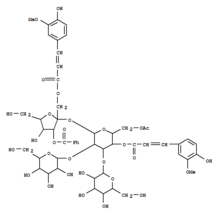 - Name: a-D-Glucopyranoside,3-O-benzoyl-1-O-[(2E)-3-(4-hydroxy-3-methoxyphenyl)-1-oxo-2-propenyl]-b-D-fructofuranosyl O-b-D-glucopyranosyl-(1®2)-O-[b-D-glucopyranosyl-(1®3)]-, 6-acetate4-[(2E)-3-(4-hydroxy-3-methoxyphenyl)-2-propenoate] (9CI)
