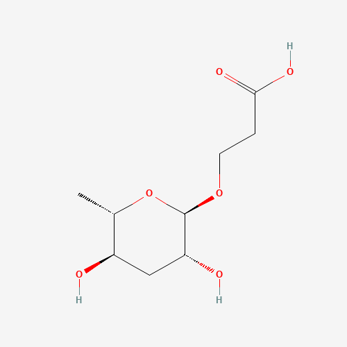 - Synonyms:ascr#5;ascaroside C3;1086696-26-5;CHEBI:78829;3-[(3,6-dideoxy-alpha-L-arabino-hexopyranosyl)oxy]propanoic acid;3-[(2R,3R,5R,6S)-3,5-dihydroxy-6-methyloxan-2-yl]oxypropanoic acid;Propanoic acid, 3-[(3,6-dideoxy-alpha-L-arabino-hexopyranosyl)oxy]-;3-(((2R,3R,5R,6S)-3,5-Dihydroxy-6-methyltetrahydro-2H-pyran-2-yl)oxy)propanoic acid;MLS002460583;CHEMBL1714874;DTXSID001317806;HMS2200P19;HY-N6978;AKOS040740708;MS-23222;SMR001382724;CS-0101359;J3.560.909A;3-hydroxypropanoic acid 3-O-alpha-ascarylopyranoside;Q27147980;(-)-3-(3'R,5'R-dihydroxy-6'S-methyl-(2H)-tetrahydropyran-2'-yloxy)-propanoic acid
