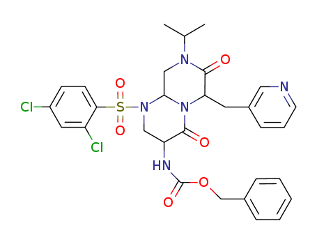 benzyl [1-(2,4-dichloro-benzenesulfonyl)-8-isopropyl-4,7-dioxo-6-(pyridin-3-ylmethyl)-octahydro-pyrazino[1,2-a]pyrimidin-3-yl]-carbamate(748163-83-9)