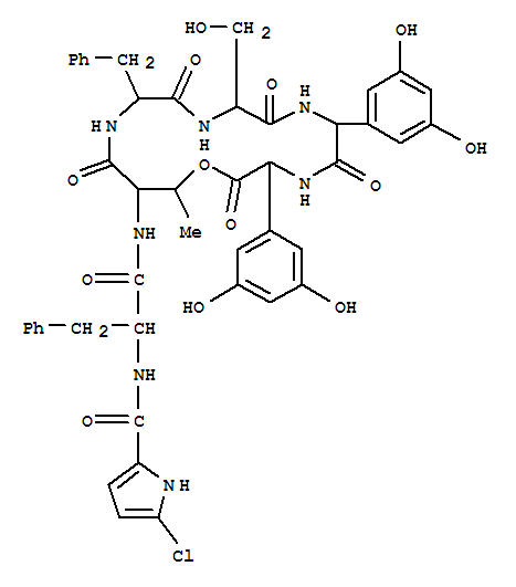 - Synonyms:CochinmicinI,1-(5-chloro-2,3,4,5-tetradehydroproline)-5-D-serine-7-[L-2-(3,5-dihydroxyphenyl)glycine]-;1-Oxa-4,7,10,13-tetraazacyclohexadecane, cyclic peptide deriv.; Glycine,N-[N-[N-[N-[N-[N-(5-chloro-2,3,4,5-tetradehydroprolyl)-L-phenylalanyl]-D-allothreonyl]-D-phenylalanyl]-D-seryl]-D-2-(3,5-dihydroxyphenyl)glycyl]-L-2-(3,5-dihydroxyphenyl)-,x-lactone
