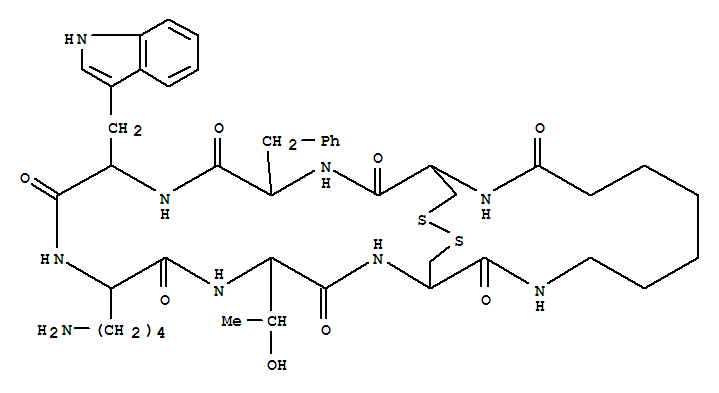 - Synonyms:L-Cysteine,N-(7-amino-1-oxoheptyl)-L-cysteinyl-L-phenylalanyl-D-tryptophyl-L-lysyl-L-threonyl-,cyclic (6®1)-peptide, cyclic (1®6)-disulfide;28,29-Dithia-2,5,8,11,14,17,25-heptaazabicyclo[14.10.4]triacontane, cyclicpeptide deriv.; L 362823