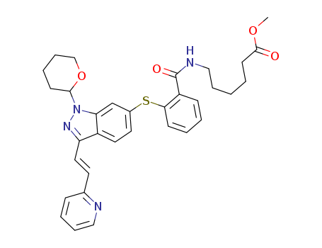 - Synonyms:methyl 6-(2-(1-(tetrahydro-2H-pyran-2-yl)-3-((E)-2-(pyridin-2-yl)vinyl)-1H-indazol-6-ylthio)benzamido)hexanoate