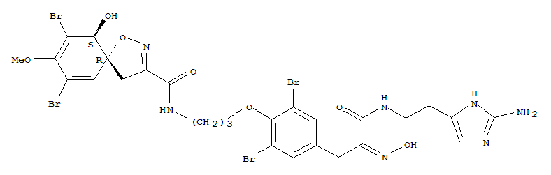 - Synonyms:1-Oxa-2-azaspiro[4.5]deca-2,6,8-triene-3-carboxamide,N-[3-[4-[3-[[2-(2-amino-1H-imidazol-4-yl)ethyl]amino]-2-(hydroxyimino)-3-oxopropyl]-2,6-dibromophenoxy]propyl]-7,9-dibromo-10-hydroxy-8-methoxy-,(5R,10S)- (9CI); 1-Oxa-2-azaspiro[4.5]deca-2,6,8-triene-3-carboxamide,N-[3-[4-[3-[[2-(2-amino-1H-imidazol-4-yl)ethyl]amino]-2-(hydroxyimino)-3-oxopropyl]-2,6-dibromophenoxy]propyl]-7,9-dibromo-10-hydroxy-8-methoxy-,(5R-trans)-; Purealin; Purealine