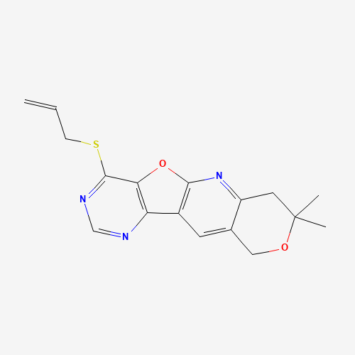 - Synonyms:MLS000758856;CHEMBL1328148;DTXSID401321394;HMS2806J20;STK594124;AKOS005515580;900267-93-8;SMR000440124;1-Allylsulfanyl-8,8-dimethyl-8,9-dihydro-6H-7,11-dioxa-2,4,10-triaza-benzo[b]fluorene;5,5-dimethyl-15-prop-2-enylsulfanyl-6,17-dioxa-2,12,14-triazatetracyclo[8.7.0.03,8.011,16]heptadeca-1(10),2,8,11(16),12,14-hexaene;8,8-dimethyl-4-(prop-2-en-1-ylsulfanyl)-7,10-dihydro-8H-pyrano[3'',4'':5',6']pyrido[3',2':4,5]furo[3,2-d]pyrimidine