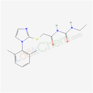 - Synonyms:2-[1-(2,6-dimethyl-phenyl)-1H-imidazol-2-ylsulfanyl]-N-ethylcarbamoyl-acetamide;1-Ethyl-3-((1-(2,6-xylyl)imidazol-2-ylthio)acetyl)urea;Acetamide,2-((1-(2,6-dimethylphenyl)-1H-imidazol-2-yl)thio)-N-((ethylamino)carbonyl);Urea,1-ethyl-3-((1-(2,6-xylyl)imidazol-2-ylthio)acetyl);