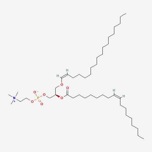 - Synonyms:PC(P-18:0/18:1(9Z));PC(P-18:0/18:1);1-(1Z-octadecenyl)-2-(9Z-octadecenoyl)-sn-glycero-3-phosphocholine;1-(1-enyl-stearoyl)-2-oleoyl-sn-glycero-3-phosphocholine;1-[(1Z)-octadecenyl]-2-[(9Z)-octadecenoyl]-sn-glycero-3-phosphocholine;799268-63-6;3,5,9-Trioxa-4-phosphaheptacos-10-en-1-aminium, 4-hydroxy-N,N,N-trimethyl-7-[[(9Z)-1-oxo-9-octadecen-1-yl]oxy]-, inner salt, 4-oxide, (7R,10Z)-;SCHEMBL2124044;CHEBI:86241;DSWOVBIRJNAJAF-NVJOKYTBSA-N;1-(1-enyl-stearoyl)-2-oleoyl-GPC;LMGP01030013;GPC(P-18:0/18:1);Q27159025;1-(1-enyl-stearoyl)-2-oleoyl-GPC (P-18:0/18:1);1-[(1Z)-octadecenyl]-2-oleoyl-sn-glycero-3-phosphocholine;(2R)-2-{[(9Z)-octadec-9-enoyl]oxy}-3-{[(1Z)-octadec-1-en-1-yl]oxy}propyl 2-(trimethylazaniumyl)ethyl phosphate;3,5,9-Trioxa-4-phosphaheptacos-10-en-1-aminium,4-hydroxy-N,N,N-trimethyl-7-[[(9Z)-1-oxo-9-octadecen-1-yl]oxy]-,innersalt,4-oxide,(7R,10Z)-