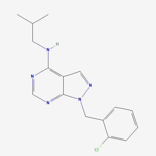 - Synonyms:1-(2-chlorobenzyl)-N-(2-methylpropyl)-1H-pyrazolo[3,4-d]pyrimidin-4-amine;903203-68-9;MLS001215848;CHEMBL1552668;DTXSID601321126;HMS2853H07;STK612876;AKOS005176249;1-[(2-chlorophenyl)methyl]-N-(2-methylpropyl)pyrazolo[3,4-d]pyrimidin-4-amine;SMR000544802;Z1172235426