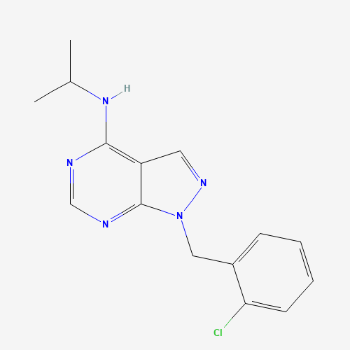 - Synonyms:1-(2-chlorobenzyl)-N-(propan-2-yl)-1H-pyrazolo[3,4-d]pyrimidin-4-amine;903858-90-2;MLS001215860;CHEMBL1553153;DTXSID701321181;HMS2877A08;STK615258;1-[(2-chlorophenyl)methyl]-N-propan-2-ylpyrazolo[3,4-d]pyrimidin-4-amine;AKOS005176255;SMR000544803;Z1172235429