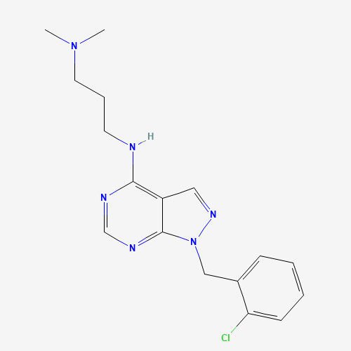 - Synonyms:903196-12-3;1-[(2-chlorophenyl)methyl]-N-[3-(dimethylamino)propyl]-1H-pyrazolo[3,4-d]pyrimidin-4-amine;MLS001215824;CHEMBL1716965;DTXSID901324850;HMS2852D17;STK602368;AKOS005176213;N-[1-[(2-chlorophenyl)methyl]pyrazolo[3,4-d]pyrimidin-4-yl]-N',N'-dimethylpropane-1,3-diamine;SMR000544800;Z1172116253;N'-[1-(2-chlorobenzyl)-1H-pyrazolo[3,4-d]pyrimidin-4-yl]-N,N-dimethylpropane-1,3-diamine