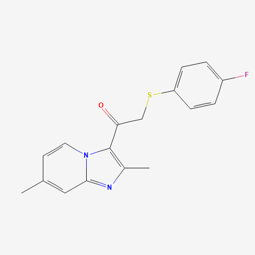 - Synonyms:478042-05-6;1-(2,7-dimethylimidazo[1,2-a]pyridin-3-yl)-2-[(4-fluorophenyl)sulfanyl]-1-ethanone;1-(2,7-dimethylimidazo[1,2-a]pyridin-3-yl)-2-(4-fluorophenyl)sulfanylethanone;1-{2,7-dimethylimidazo[1,2-a]pyridin-3-yl}-2-[(4-fluorophenyl)sulfanyl]ethan-1-one;Oprea1_360672;DTXSID601142435;AKOS005089637;3R-1199;1-(2,7-dimethyl imidazo[1,2-a]pyridin-3-yl)-2-((4-fluorophenyl)sulfanyl)-1-ethanone;1-(2,7-Dimethylimidazo[1,2-a]pyridin-3-yl)-2-[(4-fluorophenyl)thio]ethanone