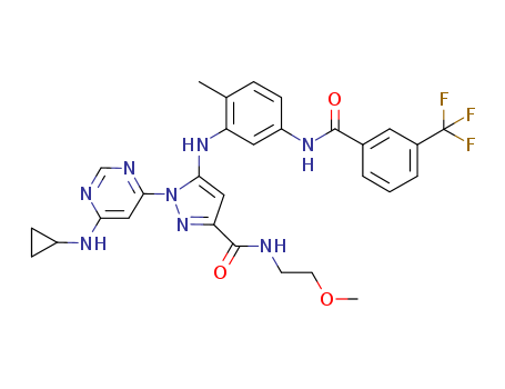 1-(6-cyclopropylaminopyrimidin-4-yl)-5-(2-methyl-5-(3-trifluoromethylbenzoylamino)phenylamino)-1H-pyrazole-3-carboxylic acid (2-methoxyethyl)amide(1018468-33-1)