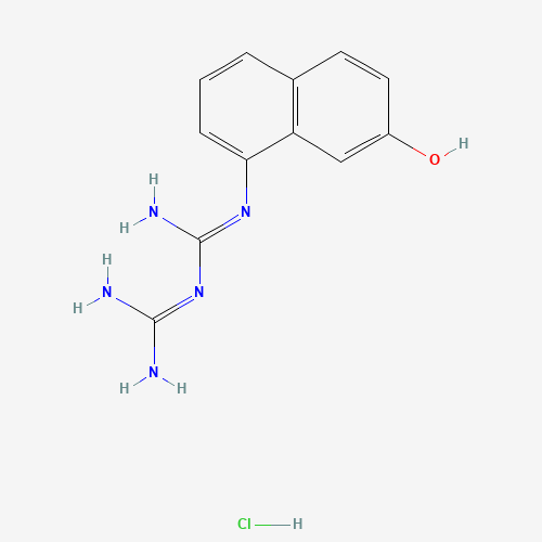 - Synonyms:1-(7-Hydroxy-1-naphthyl)biguanide hydrochloride;U89CXZ9JHS;UNII-U89CXZ9JHS;1-Biguanidino-7-naphthol hydrochloride;21528-12-1;Biguanide, 1-(7-hydroxy-1-naphthyl)-, monohydrochloride;Imidodicarbonimidic diamide, N-(7-hydroxy-1-naphthalenyl)-, monohydrochloride;Imidodicarbonimidic diamide, N-(7-hydroxy-1-naphthalenyl)-, hydrochloride (1:1);32444-68-1;DTXSID80944135;Q27290853;N-(7-Hydroxynaphthalen-1-yl)triimidodicarbonic diamide--hydrogen chloride (1/1)
