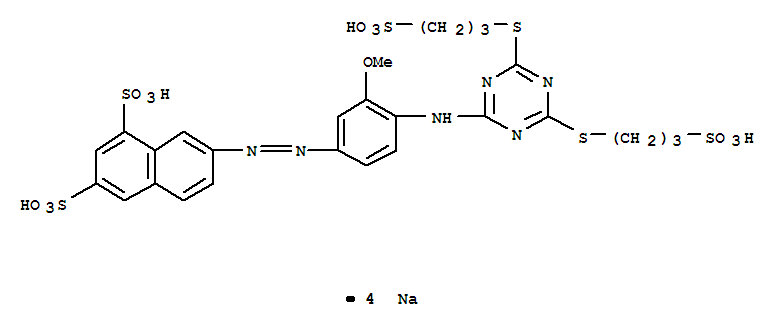 - Name: 1,3-Naphthalenedisulfonic acid, 7-4-4,6-bis(3-sulfopropyl)thio-1,3,5-triazin-2-ylamino-3-methoxyphenylazo-, tetrasodium salt