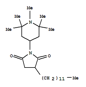 - Synonyms:2-Dodecyl-N-(1,2,2,6,6-pentamethyl-4-piperidinyl)succinimide;3-Dodecyl-1-(1,2,2,6,6-pentamethyl-4-piperidyl)pyrrolidine-2,5-dione;3-Dodecyl-1-(1,2,2,6,6-pentamethylpiperidin-4-yl)pyrrolidine-2,5-dione;3-Dodecyl-N-(1,2,2,6,6-pentamethyl-4-piperidinyl)succinimide; Cyasorb UV 3641;Hals Methyl S 95; N-(1,2,2,6,6-Pentamethyl-4-piperidyl)-n-dodecylsuccinimide;N-1,2,2,6,6-Pentamethylpiperidin-4-yl-n-dodecylsuccinimide; Sanduvor 3056
