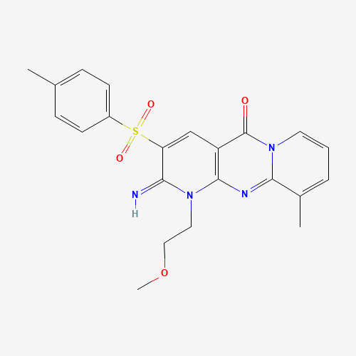 - Synonyms:371128-15-3;2-Imino-1-(2-methoxyethyl)-10-methyl-3-tosyl-1H-dipyrido[1,2-a:2',3'-d]pyrimidin-5(2H)-one;Oprea1_348495;STK703683;AKOS000526717;Z57783757;2-Imino-1-(2-methoxy-ethyl)-8-methyl-3-(toluene-4-sulfonyl)-1,2-dihydro-1,9,10a-;2-imino-1-(2-methoxyethyl)-10-methyl-3-[(4-methylphenyl)sulfonyl]-1,2-dihydro-5H-dipyrido[1,2-a:2',3'-d]pyrimidin-5-one;2-IMINO-1-(2-METHOXYETHYL)-10-METHYL-3-[(4-METHYLPHENYL)SULFONYL]-1,2-DIHYDRO-5H-DIPYRIDO[1,2-A:2,3-D]PYRIMIDIN-5-ONE
